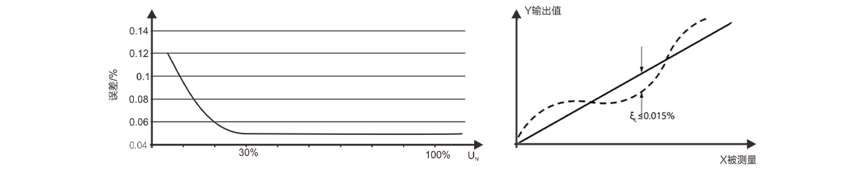 常規(guī)的電壓傳感器均為滿量程精度標(biāo)稱,半量程以下測(cè)試時(shí)偏差較大,難以滿足寬范圍測(cè)試應(yīng)用需求。VS高精度電壓傳感器具有優(yōu)異的精度、線性度指標(biāo),即便在30%UN下也可實(shí)現(xiàn)高精度測(cè)量。