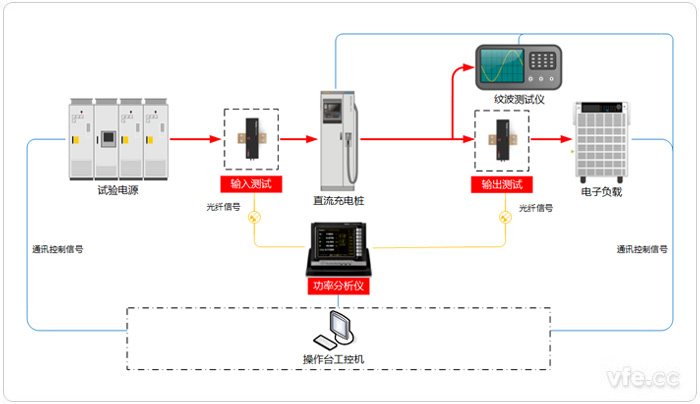 充電樁測試主要包括功能測試、安規(guī)測試、通訊測試等。如上圖直流充電樁測試系統(tǒng)原理圖所示,試驗系統(tǒng)主要由試驗電源、輸入測量模塊、被測交流充電樁、輸出測量模塊、直流電子負(fù)載、功率分析儀、紋波測試儀、溫度測試模塊、充電槍頭轉(zhuǎn)接控制設(shè)備、試驗臺電腦、打印機(jī)及相關(guān)安規(guī)試驗設(shè)備構(gòu)成。