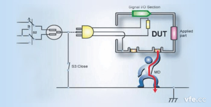 表面間接接觸電流一般是指在正常或是單一故障條件下,設(shè)備與地?zé)o關(guān)聯(lián)任意兩點(diǎn)之間的漏電流,電流從設(shè)備的一部分流經(jīng)人體后流入設(shè)備的另一部分。(如圖5)