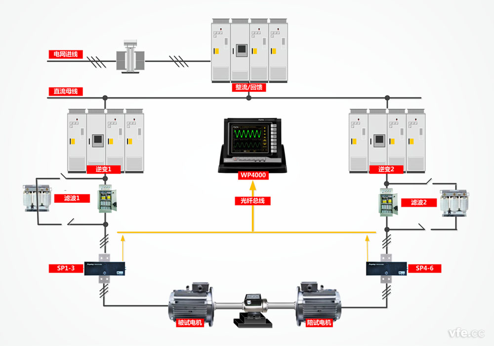 三相異步電機試驗臺采用變頻器供電, 輸入可以通過開關來確定是否需要投入LC濾波器。采用同型號、同規(guī)格兩臺同步電動機以對拖的方式進行負載溫升試驗,SP1采用SP103152C*3變頻功率傳感器測量試驗電源的輸出電量,SP2采用SP103152C*3變頻功率傳感器測量陪試電源輸入電量。在被試機運行時,使陪試電動機作為負載作發(fā)電機運行, 將試驗能量回饋10kV電網。變頻功率傳感器通過光纖傳輸至WP4000變頻功率分析儀對應功率單元通訊接口。